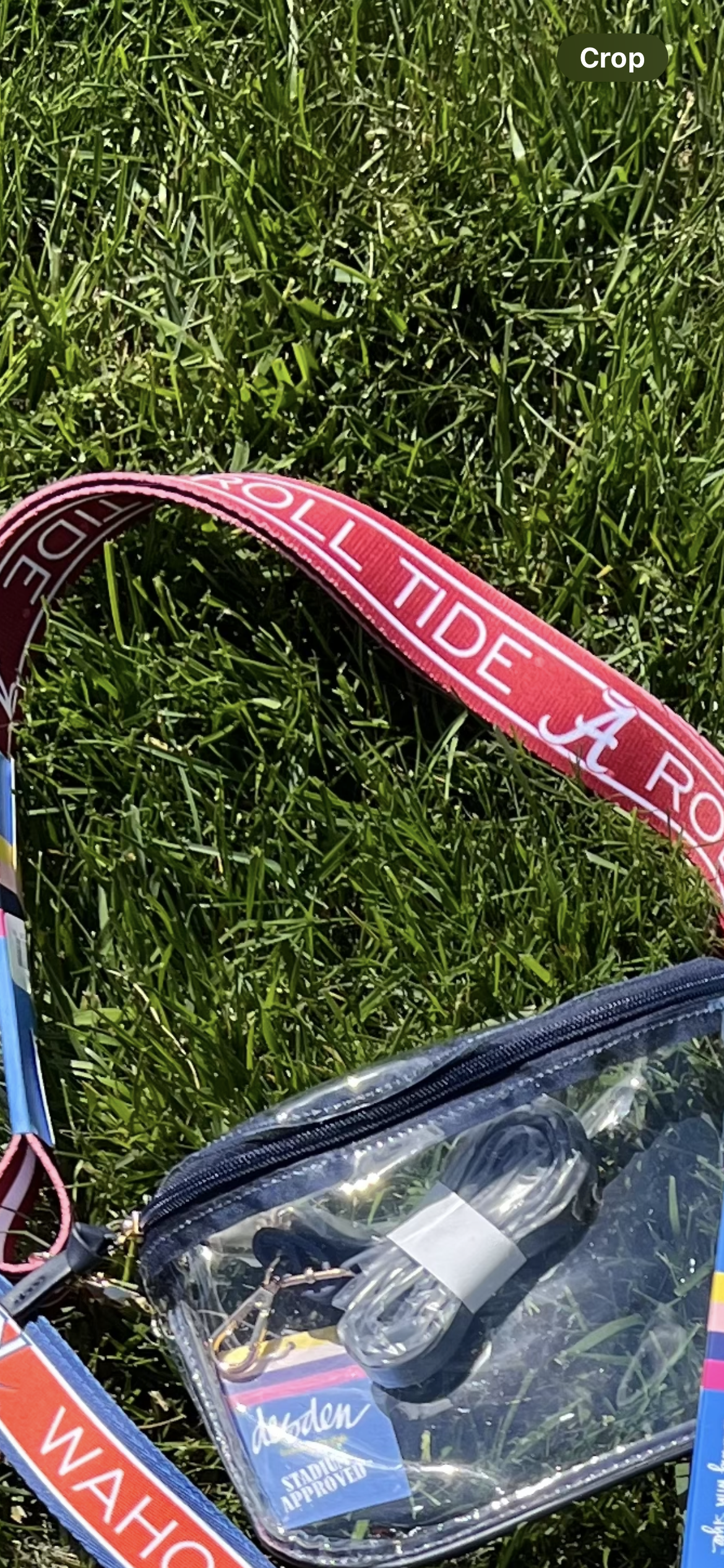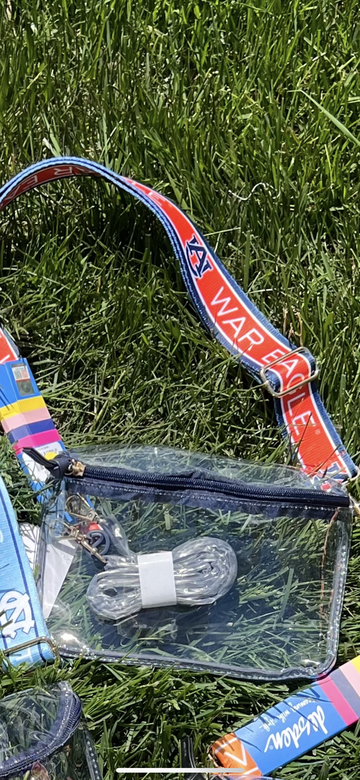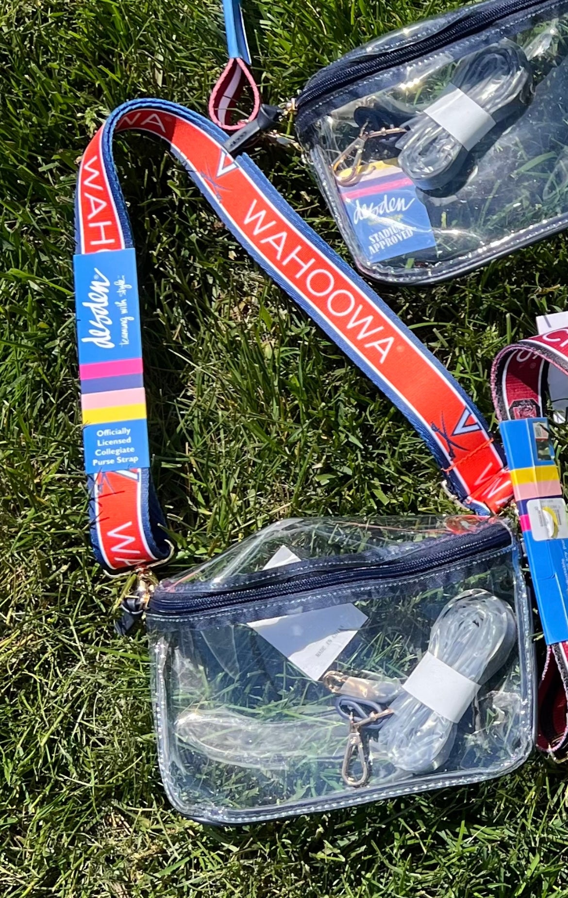 *University Licensed* by Desden, Our new trend-forward clear belt bag features zipper closure, vegan leather trim and comes with two adjustable purse straps! (collegiate licensed), or for every day go with the matching team colored vegan leather strap. High-quality brass hardware. Stadium Approved. By Desden