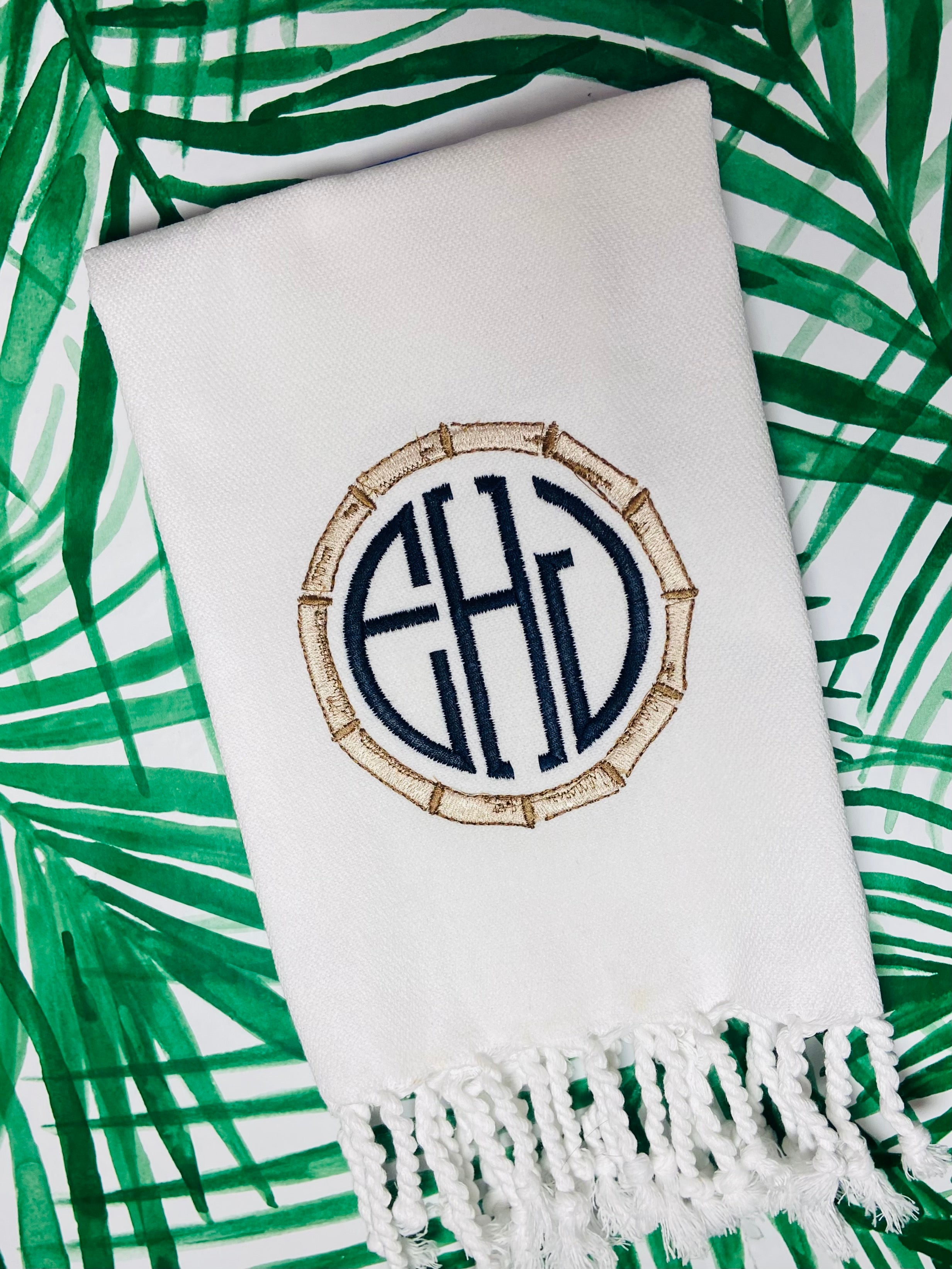 Turkish Hand Towels are a beautiful addition to any bathroom. Great Hostess Gift! Shown in Taupe & Navy.