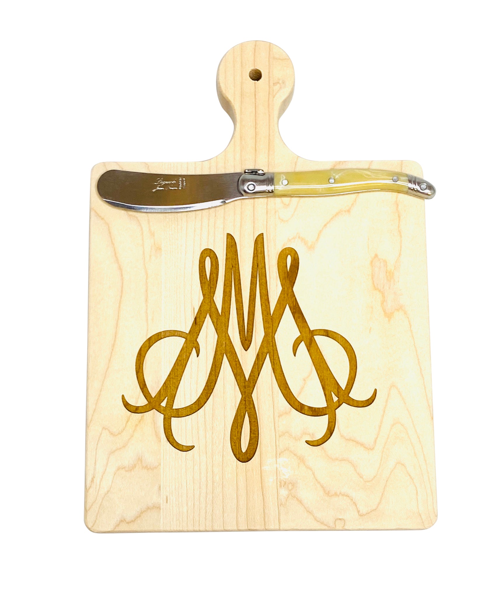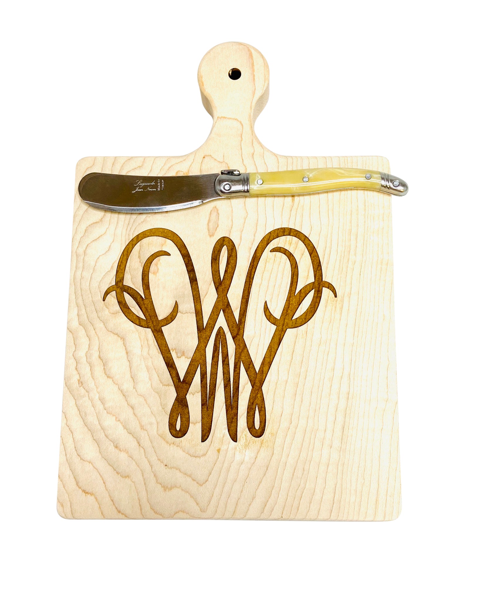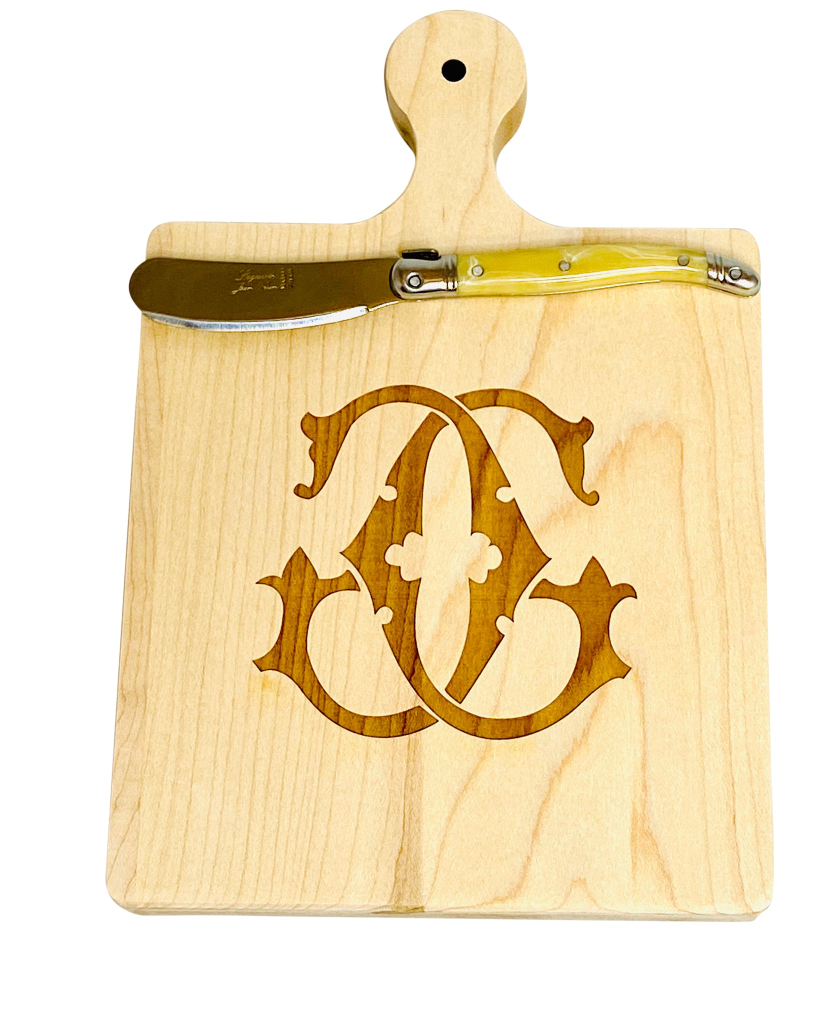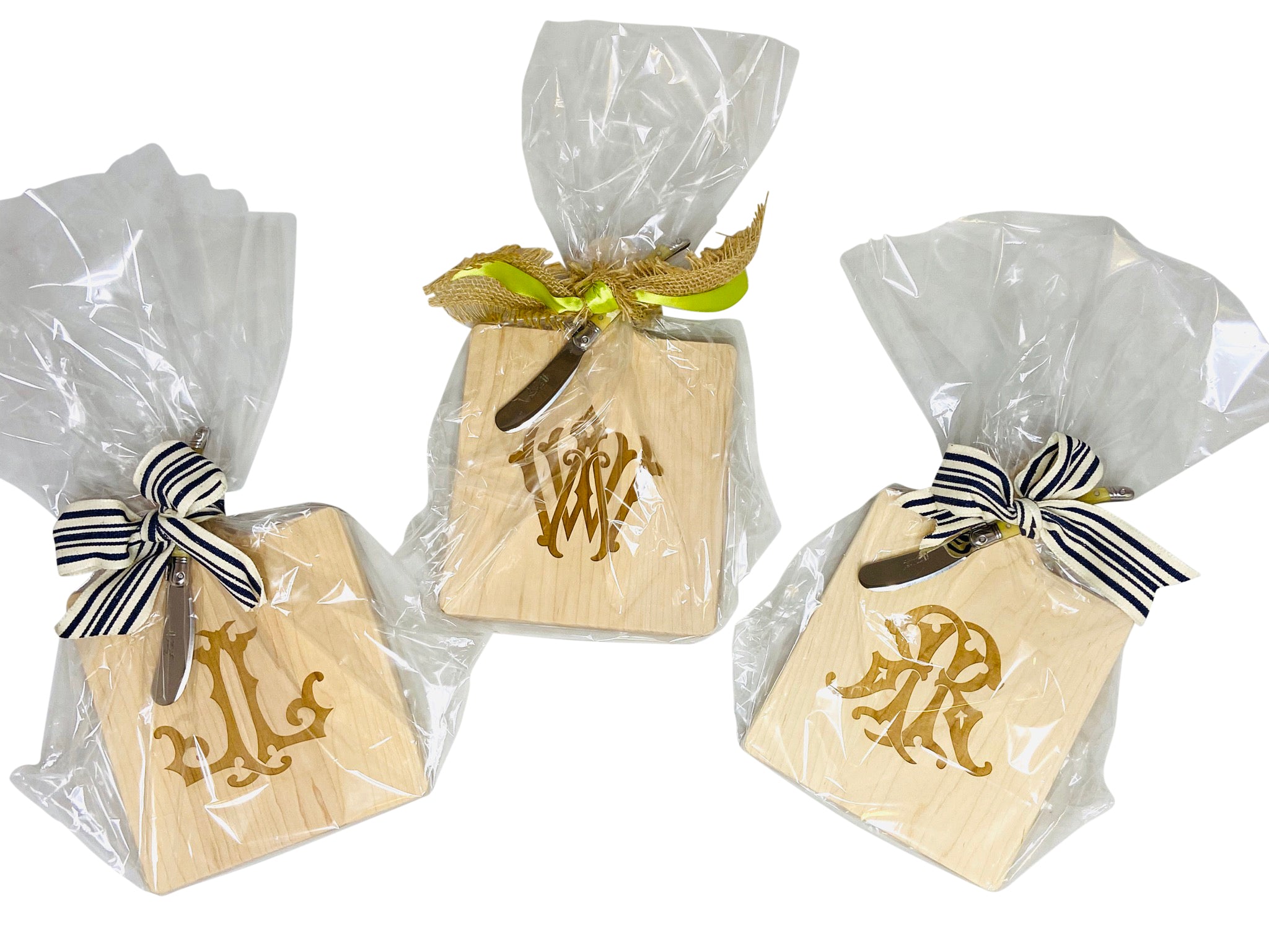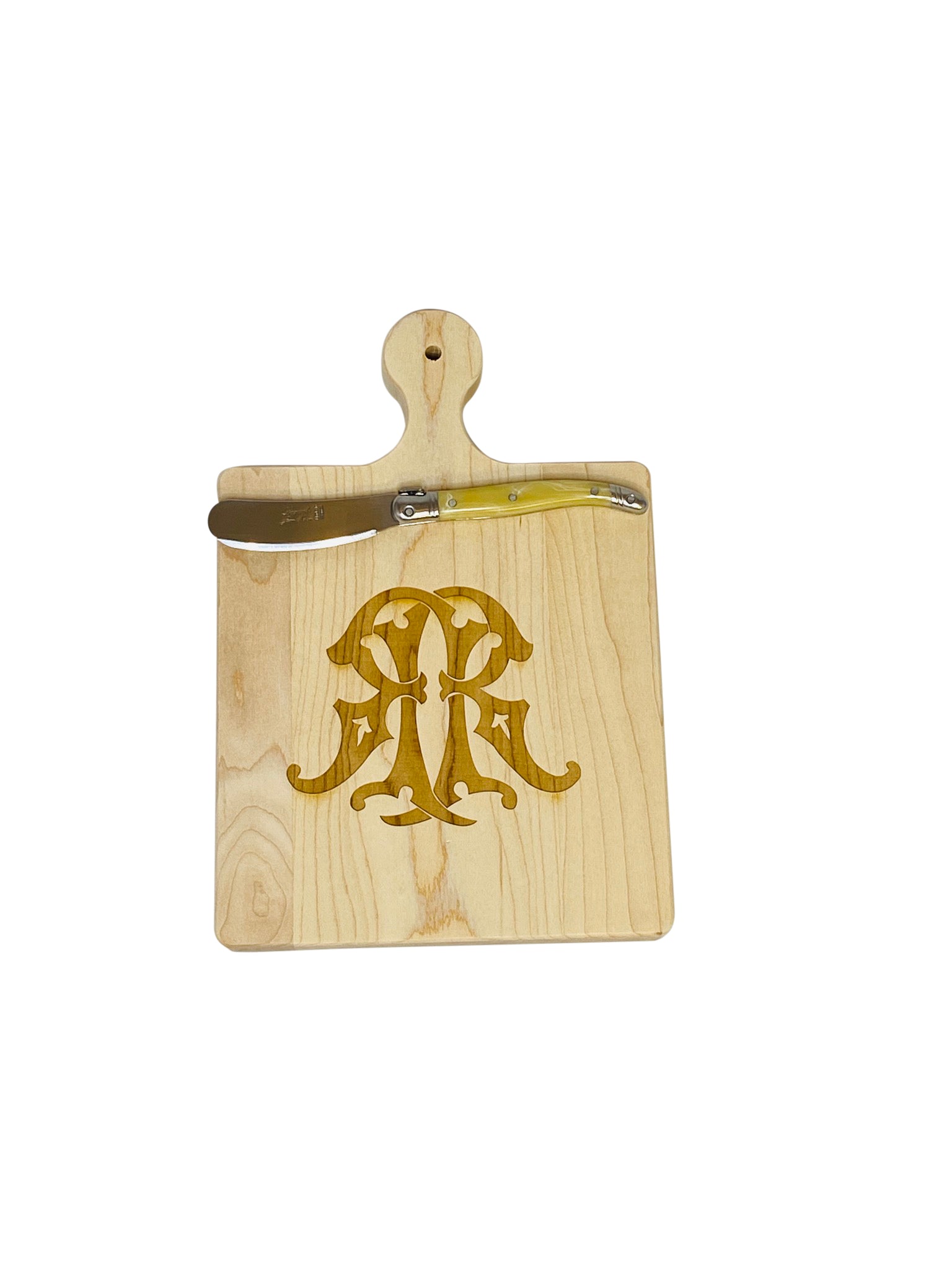A monogrammed artisan board in our 1-letter interlock style. Comes as a set with a cheese knife. Perfect as a gift or for your own home. Comes beautifully gift wrapped as shown!