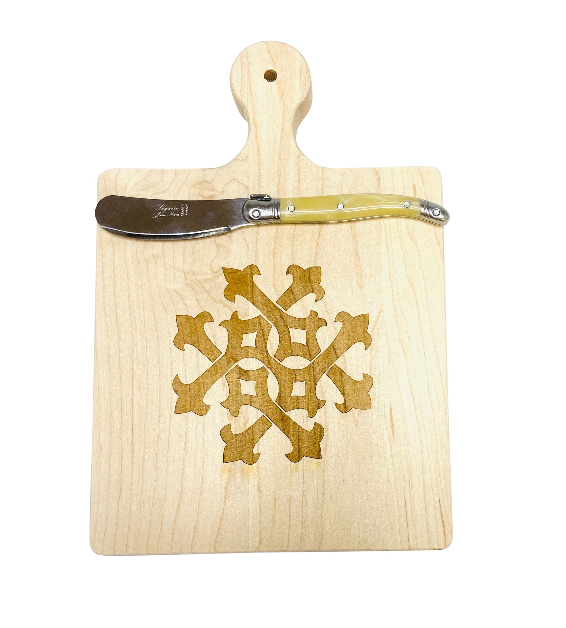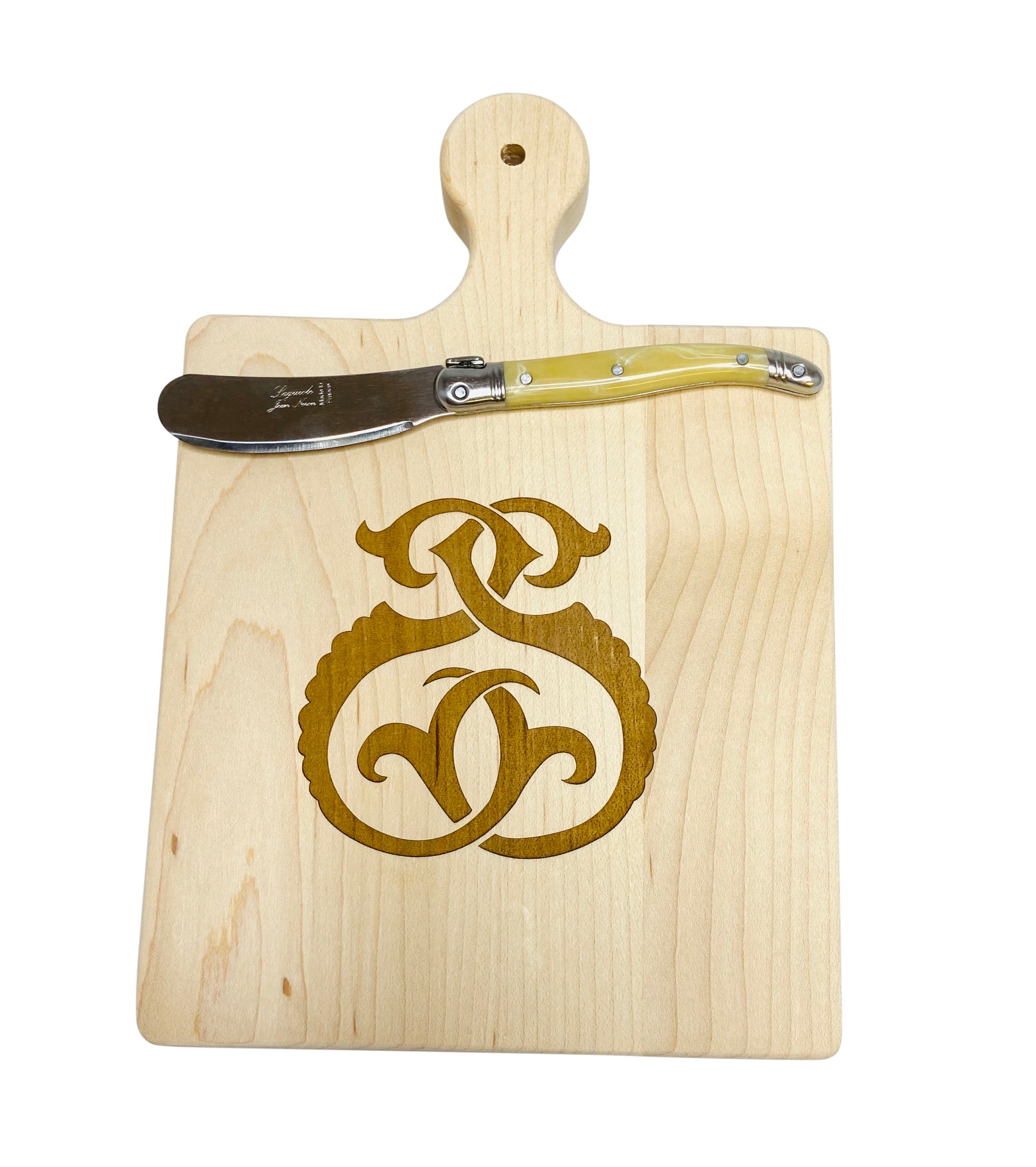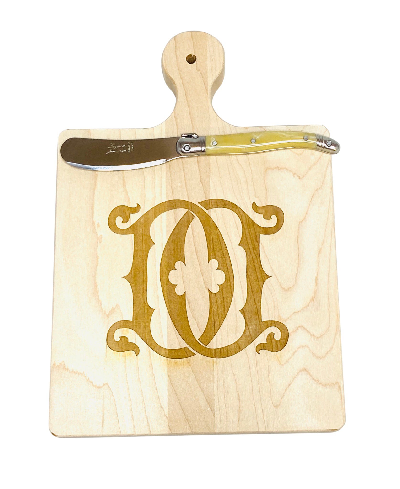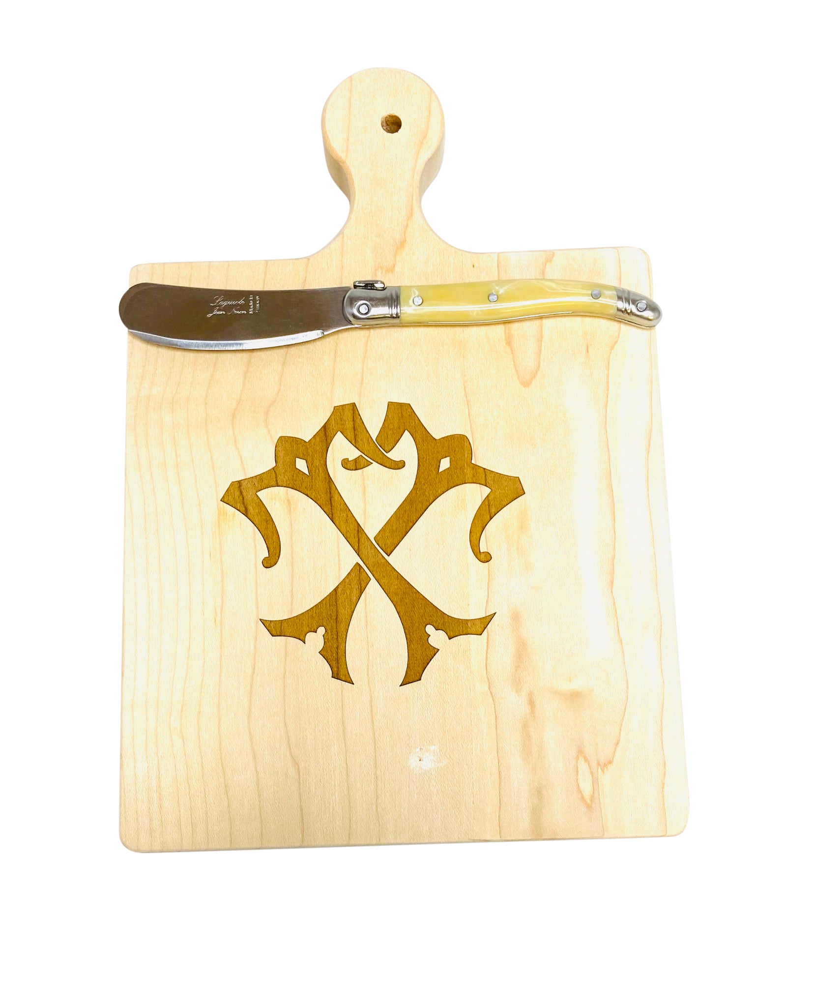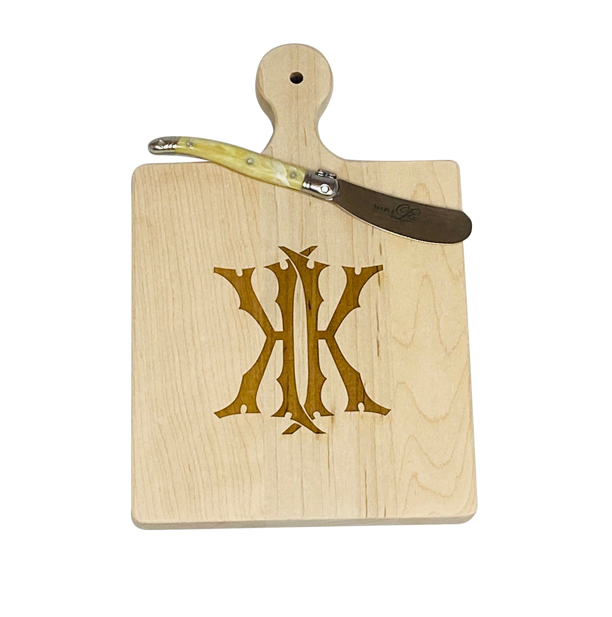 A monogrammed artisan board in our 1-letter interlock style. Comes as a set with a cheese knife. Perfect as a gift or for your own home. Comes beautifully gift wrapped as shown!