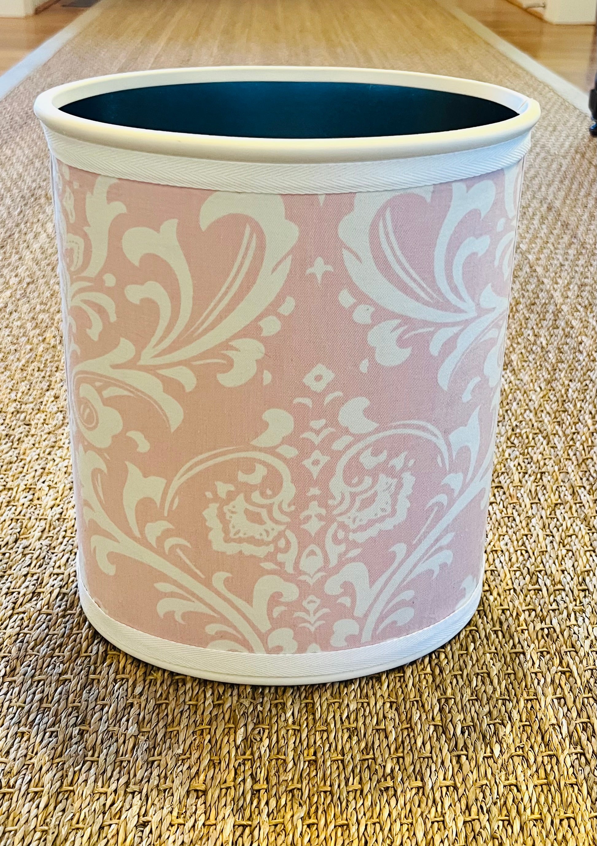 Our beautiful oval fabric covered wastebaskets add instant glamour &  style to any room. They are made of steel with rubber bumpers to protect your floors. Made by hand to last forever. Who says trash cans can't be beautiful?