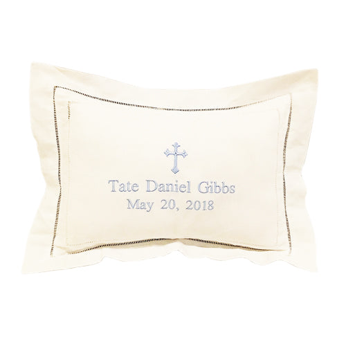 Sweet little pillow embroidered with a cross, baby’s name & date.